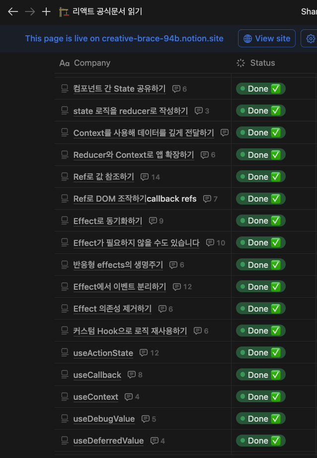 책 스터디와 달리 공식 문서는 React와 직접 연관되어 있어 가장 최신 정보를 받아볼 수 있다는 점도 큰 장점이었습니다. 실제로 스터디 진행 중 React 19가 출시되면서, v18에서의 변경점을 통해 React가 추구하는 방향성을 실시간으로 이해할 수 있었습니다.