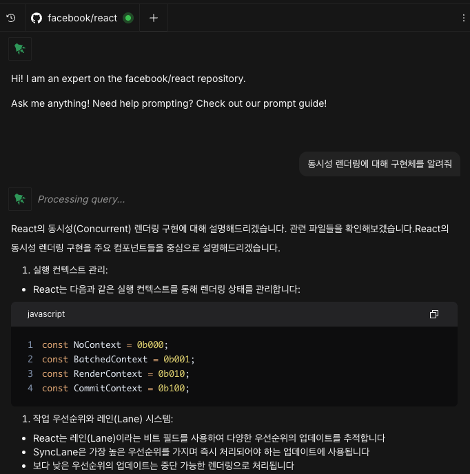 예를 들어, 동시성 렌더링에 대해 질문하면 실제 React 소스코드를 기반으로 한 답변을 받을 수 있고, 해당 코드가 위치한 파일로 직접 이동하여 전체 코드도 확인할 수 있습니다. 이를 통해 문서로만 접했던 개념들을 구체적인 구현체와 함께 학습할 수 있었습니다.