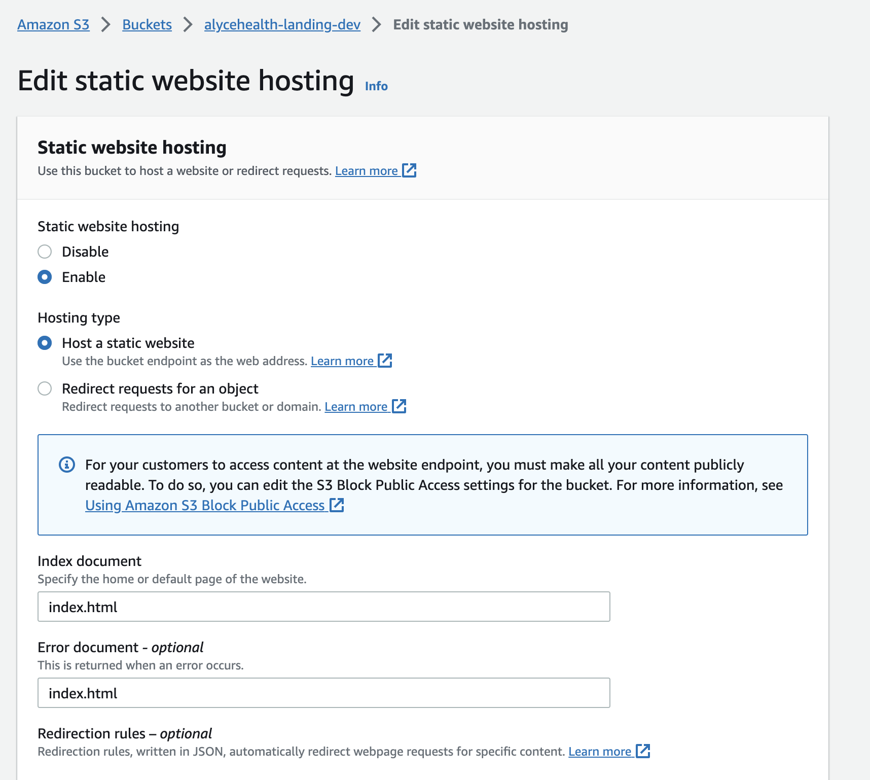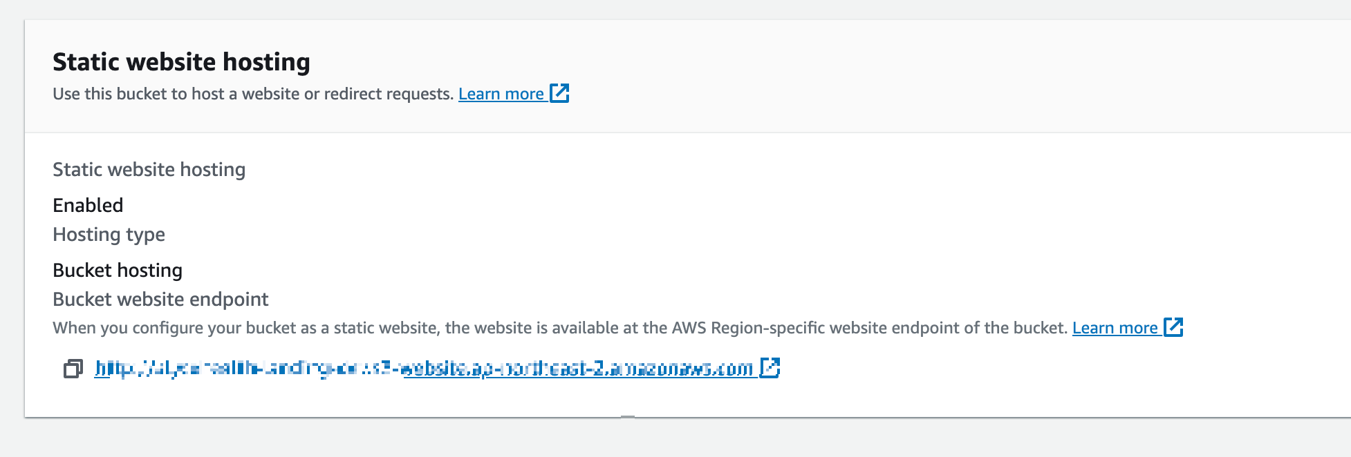 Static website hosting - Enable로 설정, Index document에는 빌드한 루트 파일 이름을 써주면 됩니다. React의 경우 index.html입니다. Error document에도 같은 파일로 설정해줍니다. 이렇게 해줘야 routing을 탈 수 있습니다. React는 jquery와 다르게 엔드포인트가 없기 때문인 것 같습니다.