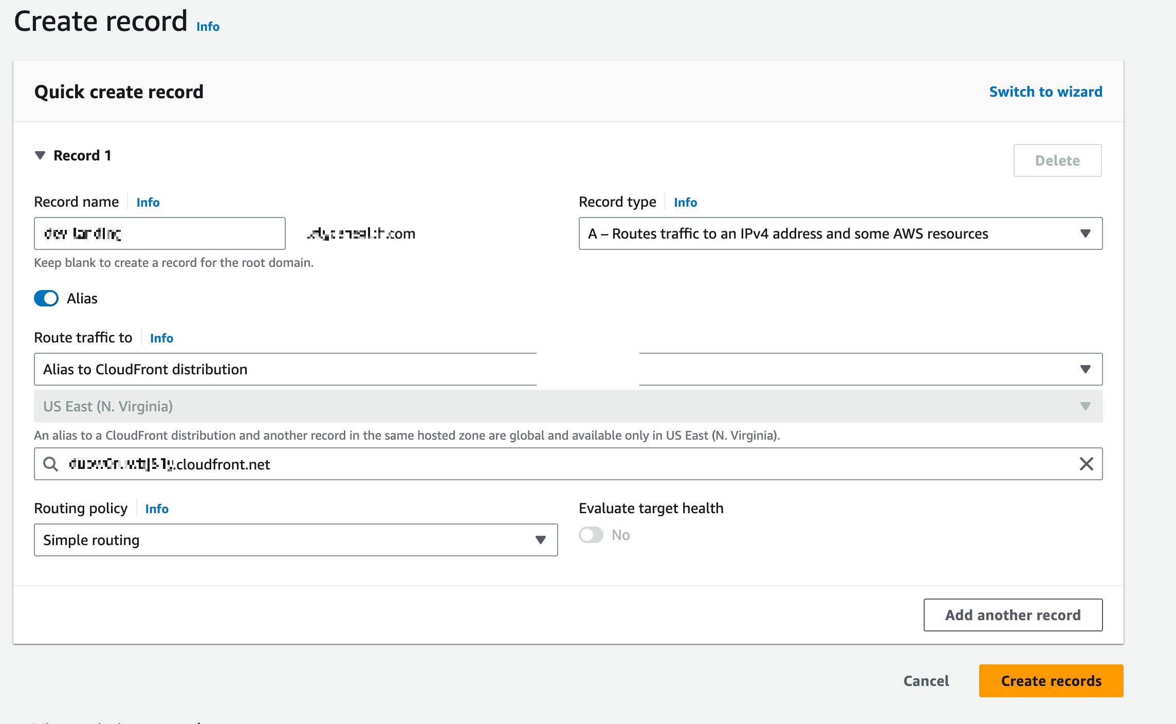 Record name에 사용하려는 주소를 입력합니다. 이 때 CloudFront에서 Alternate domain name (CNAME)를 같은 값으로 입력했다면 Alias에서 자동으로 찾아줍니다.