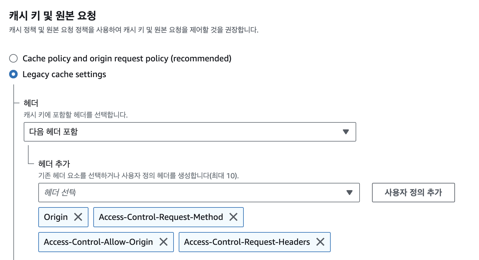 - 하단 사진은 Legacy cache settings 방법. Access-Control-Allow-Origin헤더를 추가.
