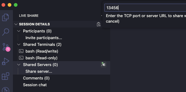 Live Share 탭에서 Share 버튼을 눌러 세션을 만듭니다.